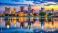 • Syracuse skyline with city lights reflecting on the water at twilight, Syracuse, New York, cityscape, evening, sunset, dusk