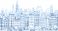 City landscape. Line urban backdrop. Skyline with clouds, different buildings on street, doodle street draw, outline cityscape hand sketch, flat houses. Hand drawn vector illustration
