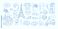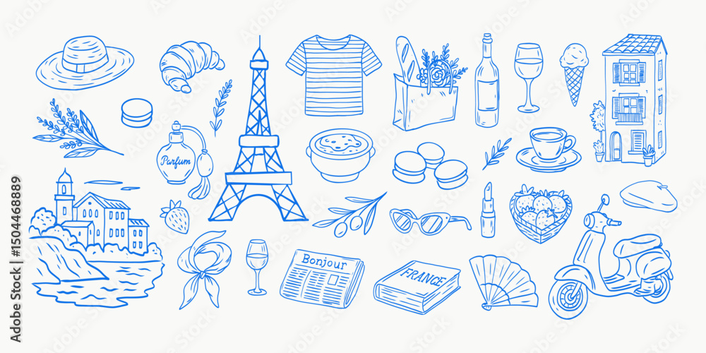 Plakat Paryż - A blue and white drawing of various food and drink items, including a bottle of wine, a cup, a... #1504468889
