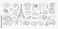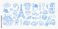 • A blue and white drawing of various food and drink items, including a bottle of wine, a cup, a bowl, a spoon, a fork, a knife, a banana, a strawberry, a cupcake, a donut, a cake