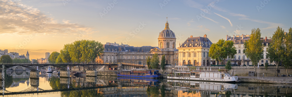 • Institut de France at sunrise reflecting on the River Seine in Paris