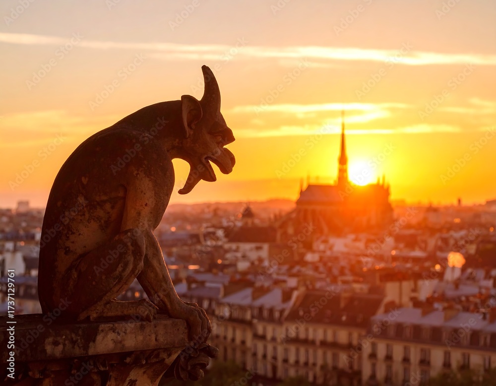 Plakat Paryż - Gargoyle overlooks cityscape at sunset #1737129761