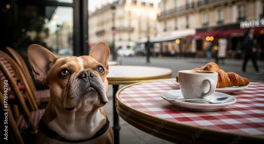 • French bulldog at cafe with coffee and croissants in paris street setting