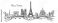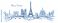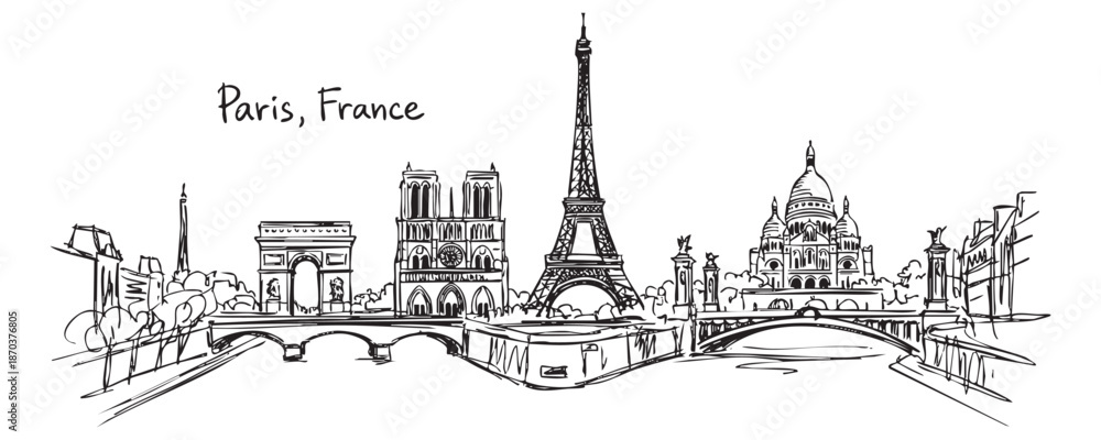 • Paris France City Skyline Sketch with Eiffel Tower, Notre Dame, Arc de Triomphe, and Seine River Hand Drawn Illustration