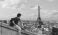 • a man with backpack looking at Eiffel tower, famous landmark and travel destination in Paris, France