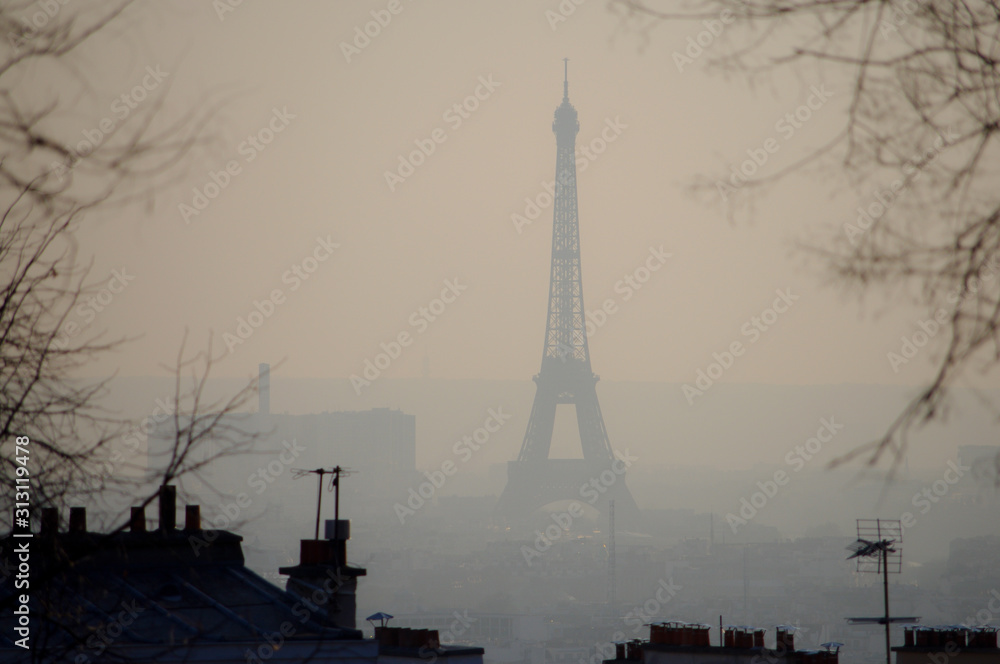 • View of the Eiffel Tower and Parisian rooftops. Fog in the air caused by pollution.