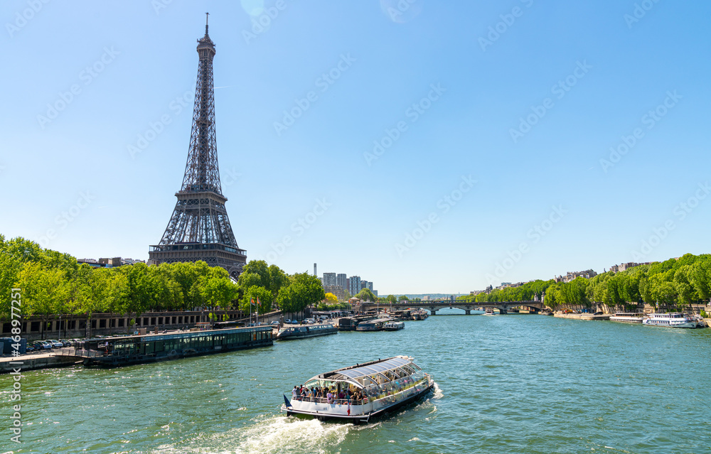 Plakat Paryż - Paris street with view on the famous paris eiffel tower on a sunny day with some sunshine #468977251