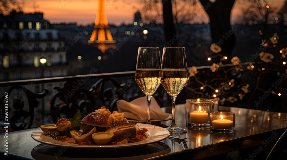 • Dinner in a restaurant in the background you can see a glowing Eiffel Tower in the evening