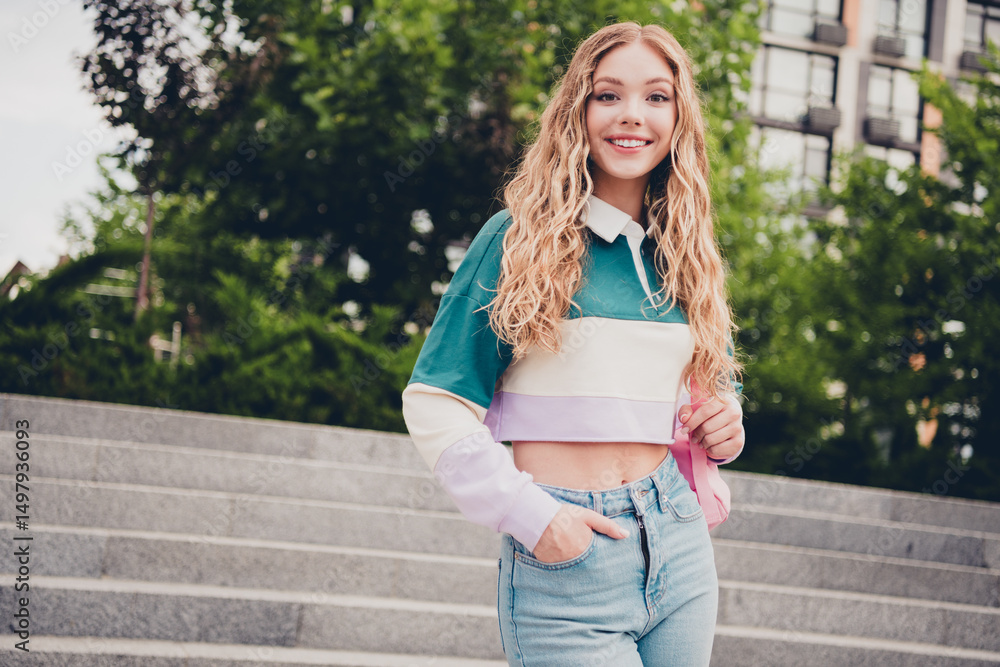 • Portrait of pretty young girl smile hold rucksack wear top stairs city center outdoors