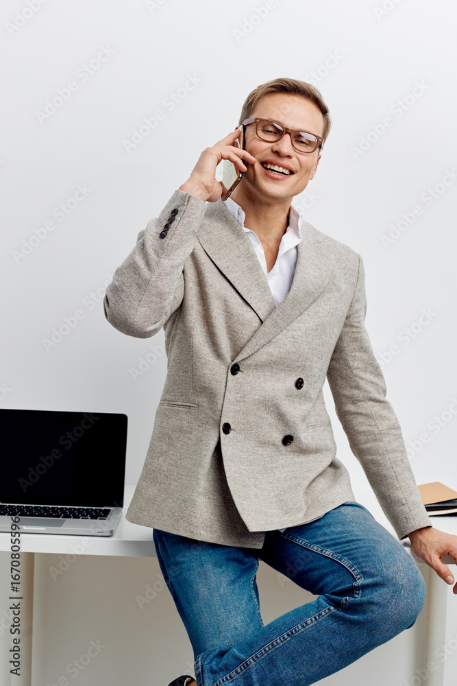 Plakat Pojazdy - smiling man talking smartphone wearing casual jacket glasses sitting white desk laptop digital... #1670805596