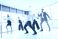 • Team of business professionals enjoying a lively group activity together in a modern office environment