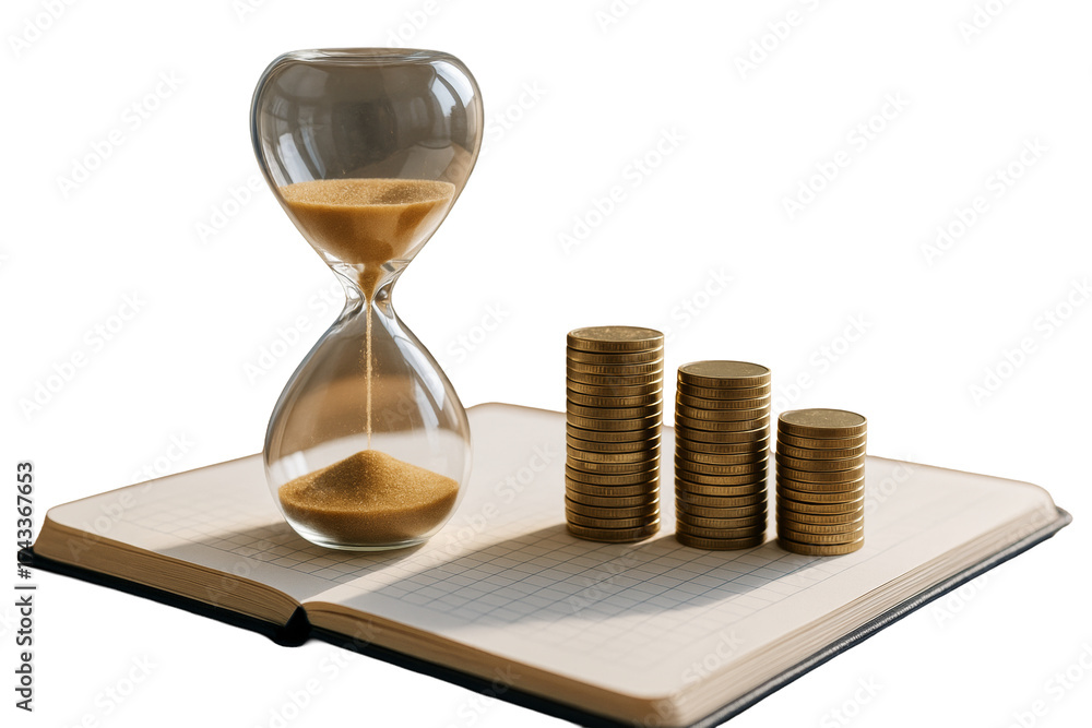 • Hourglass and gold coin stacks on open notebook, clean isolated style on white background, concept of time and money management. Ai generative