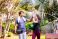 • Indian beautiful young couple high five after yoga enjoying morning fitness outdoors