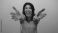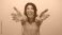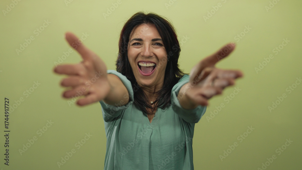 • Hispanic woman with broad smile extends bare arms forward for hug gesture in green studio; affection.