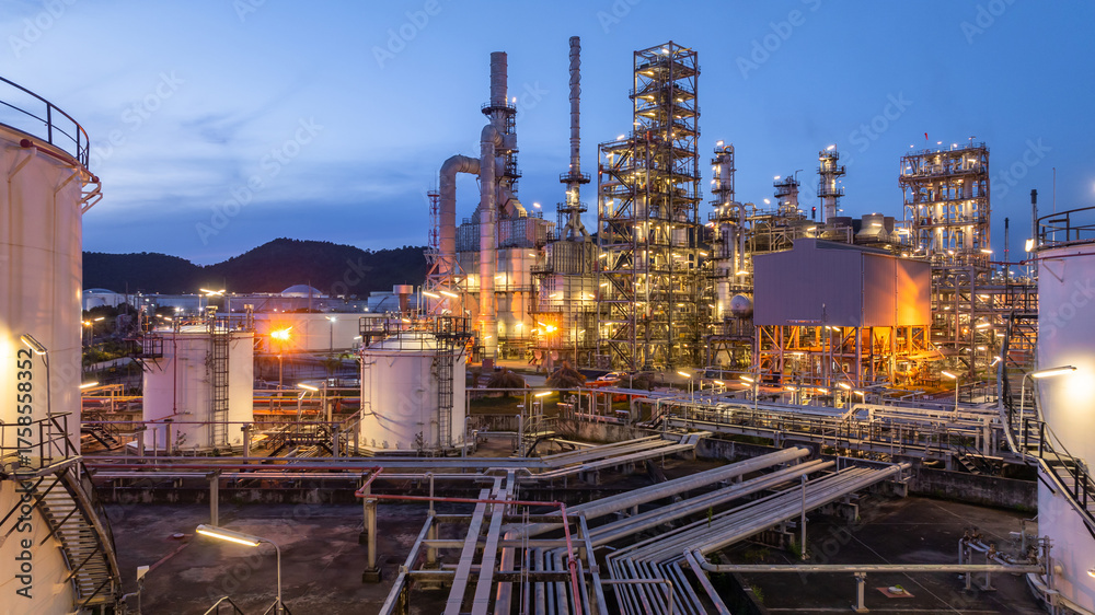 • Oil and Gas refinery plant at night, Global business energy logistic transportation, Oil and gas refinery petrochemical industrial, Petrochemical refinery industrial energy supply chain.