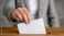 • Person places a white envelope into a ballot box during an election process in a voting station