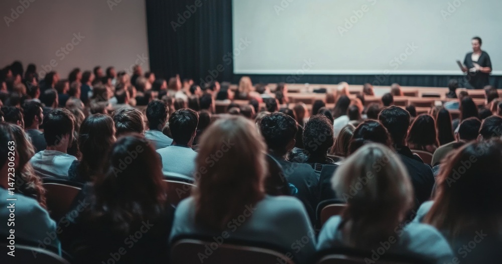 • A large audience attentively listens to a speaker during a presentation in a dimly lit auditorium. Rows of people are seated, facing a screen and a person giving a talk. : Generative AI