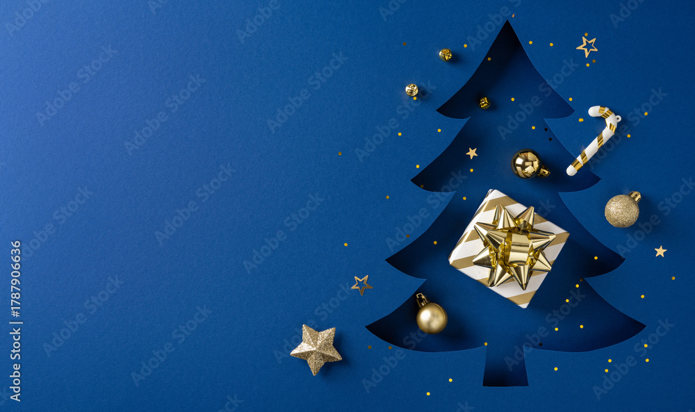 Plakat Sport - A blue backdrop hosts a dark blue Christmas tree cutout, gold gift box with bow, ornaments, and... #1787906636