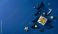 • A blue backdrop hosts a dark blue Christmas tree cutout, gold gift box with bow, ornaments, and scattered stars creating a joyful holiday mood for Christmas and New Year visuals