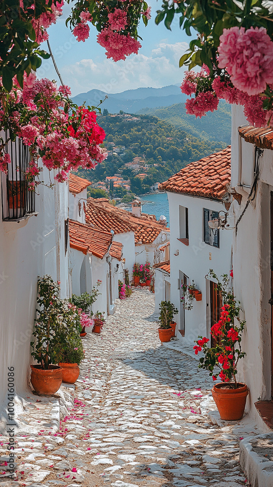 Plakat Uliczki - Białe miasteczko wąska uliczka przystrojona kwiatami, tapeta generative ai #1004160086