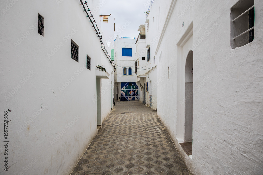 Plakat Uliczki - Urokliwa uliczka w Asilah (Maroko) z białą i niebieską zabudową #1557733686
