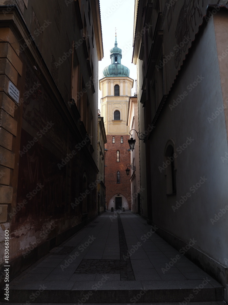 Plakat Uliczki - Ciemna uliczka z widokiem na wieżę kościoła #1830681600