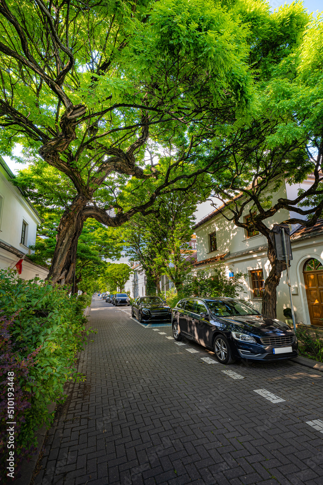 Plakat Uliczki - Piękna zielona uliczka w mieście w słoneczny dzień #510193448