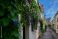 • Zielone pnącza i fioletowe kwiaty na murach i fasadach domów. Wąska prowansalska uliczka, w tle fortyfikacje i mury obronne.