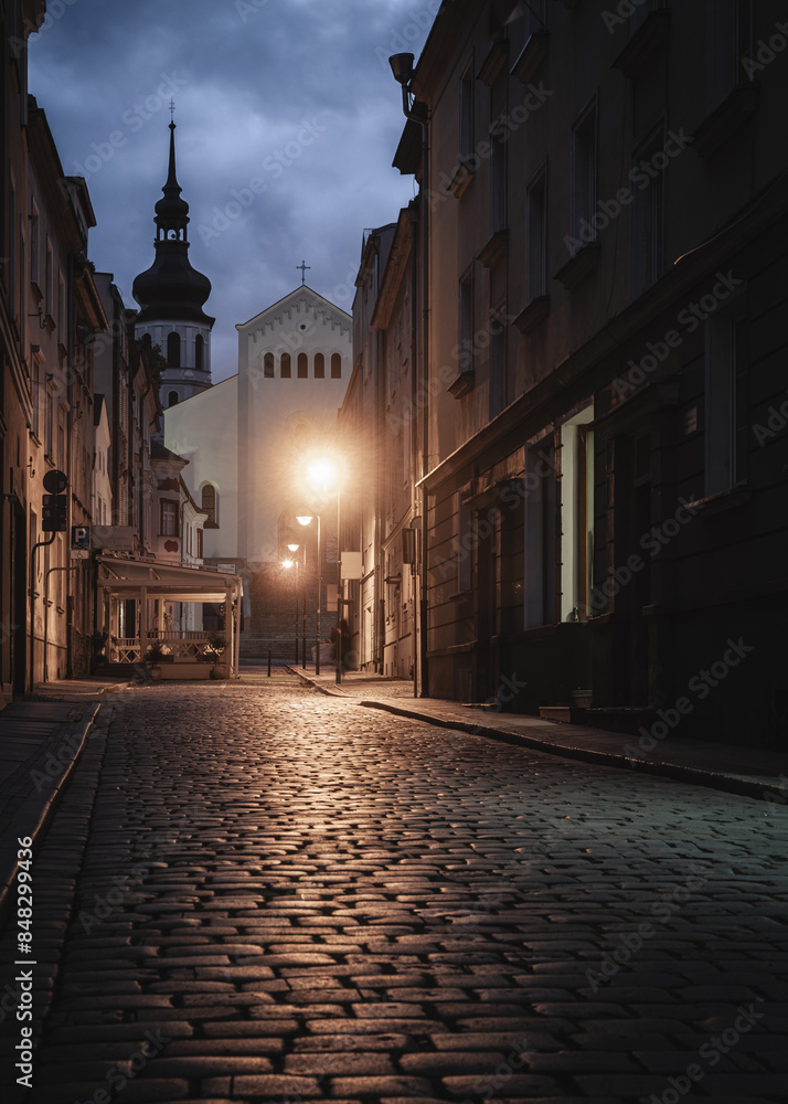 Plakat Uliczki - ciemna brukowana uliczka w nocy w mieście #848299436