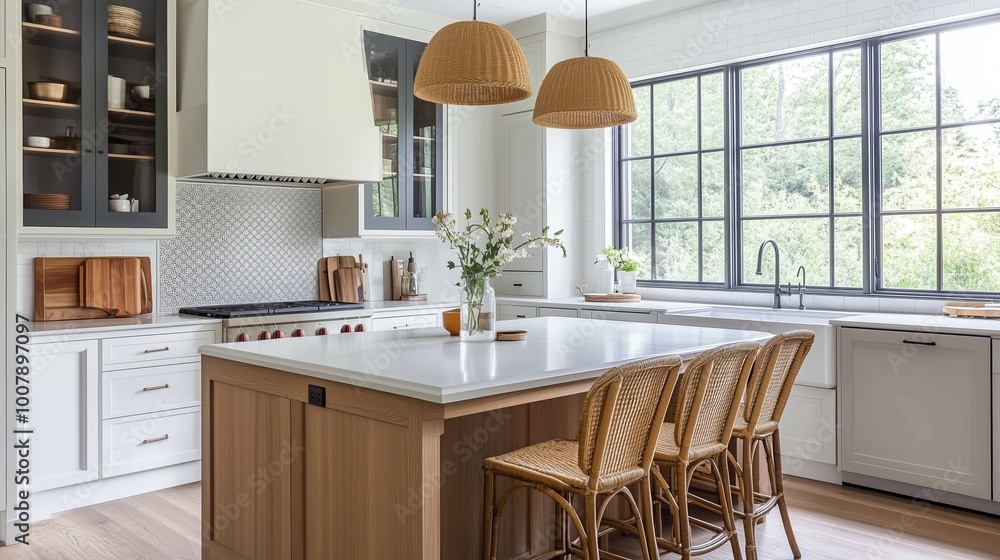 Plakat Wyspy - Modern kitchen design featuring an island with rattan chairs, large windows, and natural light,... #1007897097