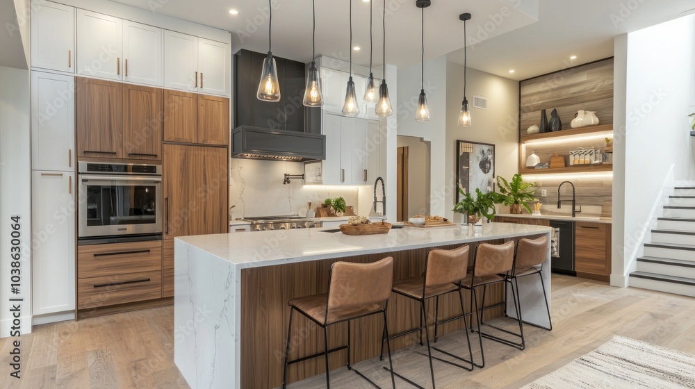 Plakat Wyspy - A contemporary kitchen with pendant lights hanging over the island and furniture, creating a... #1038630064