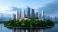 • Urban skyline development on island futuristic city aerial view nature integration modern architecture