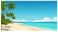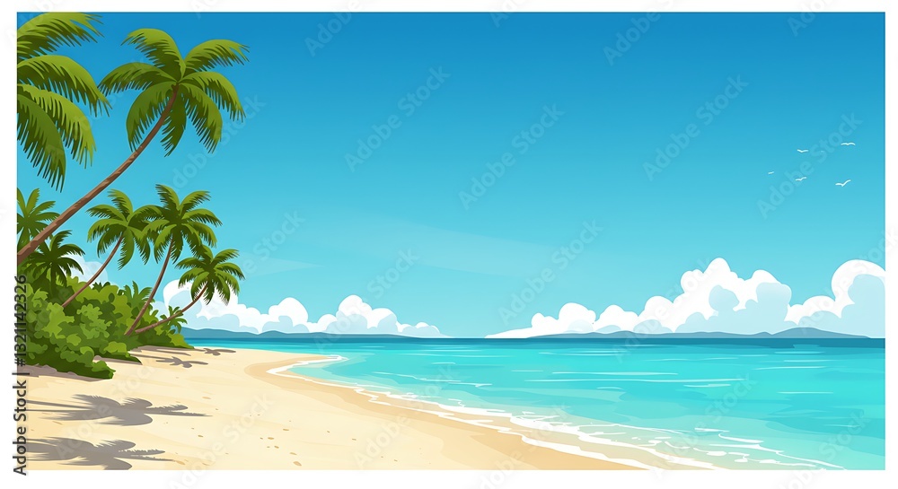 • Tropical Beach with Palm Trees, Turquoise Water and Blue Sky Day