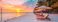 • Stunning sunset illuminating beach with umbrellas and sunbeds on tropical island