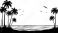 • tropical island silhouette, palm trees, beach, ocean waves, flying seagulls, black and white illustration, minimalist design, vector art, tropical paradise, vacation vibes, seaside landscape
