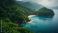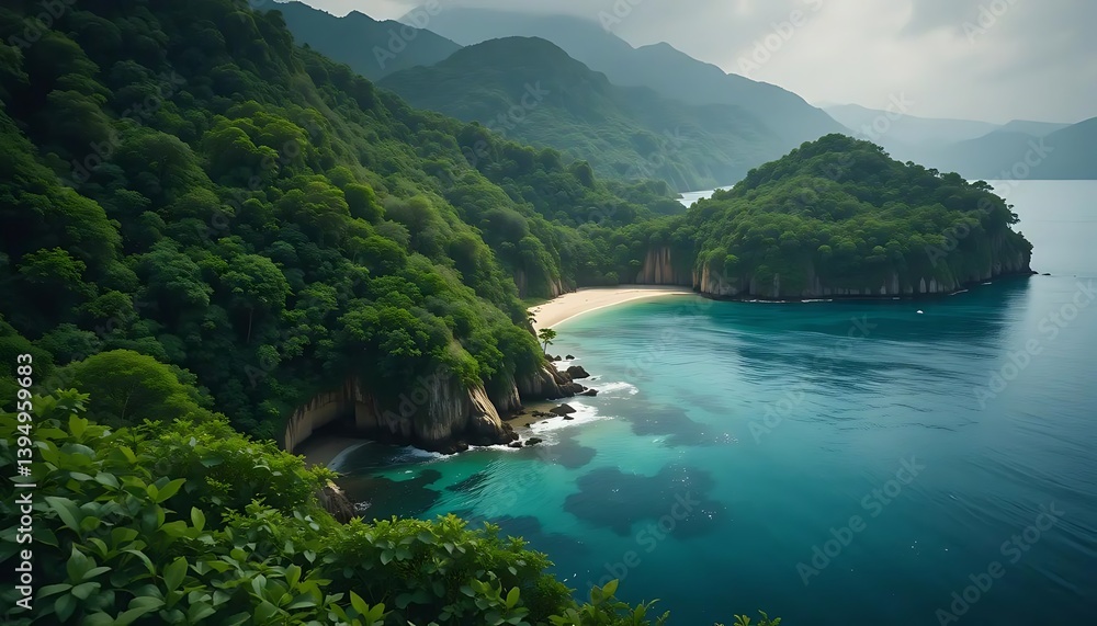 • Tropical Island Cove with Turquoise Water and Lush Green Vegetation