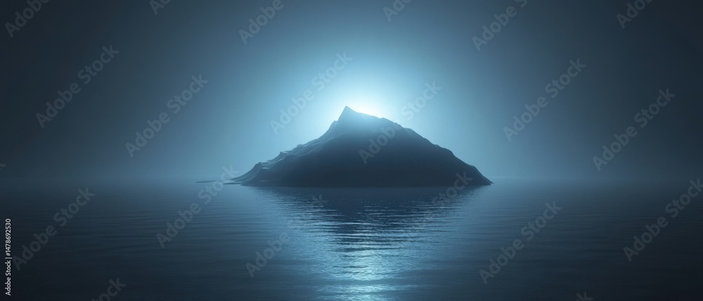 • Ethereal Island Peak Emerging from Misty Waters in Serene Landscape Photography with Glowing Light and Reflections