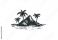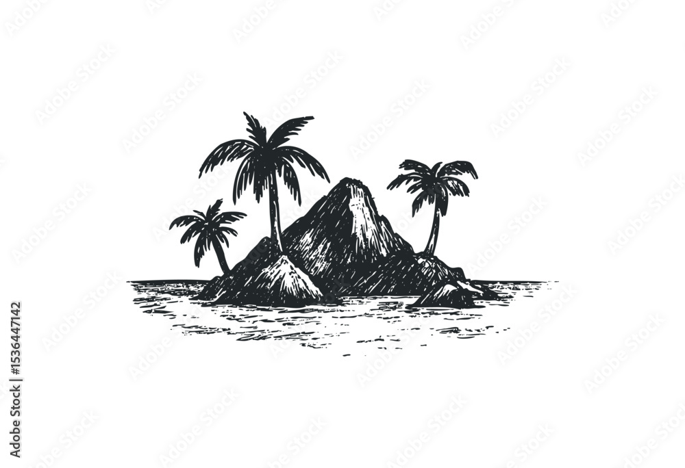 • Tropical island sketch with palm trees and ocean waves. Vector retro hand drawn illustration