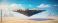• A large rocky island floats above a vast desert landscape under a bright blue sky with scattered clouds.