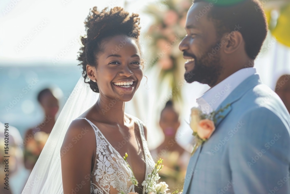 Plakat Wyspy - Happy black couple getting married at an island fashion wedding bride. #1540267961