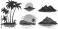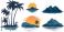 • Tropical Island Silhouettes with Palm Trees Mountains and Sunset Illustrations
