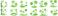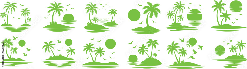 • Set of green silhouetted tropical island scenes with palm trees sun birds and water reflections