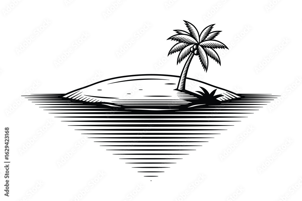 • Tropical Island with Palm Tree in the Ocean Engraving Style Vector Illustration