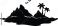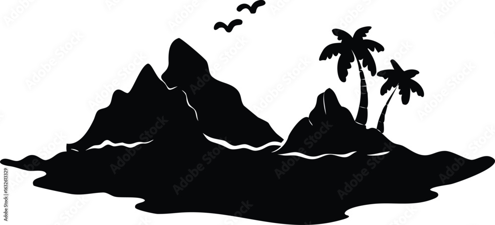 • Tropical Island Silhouette with Palm Trees Mountains and Birds, White Background