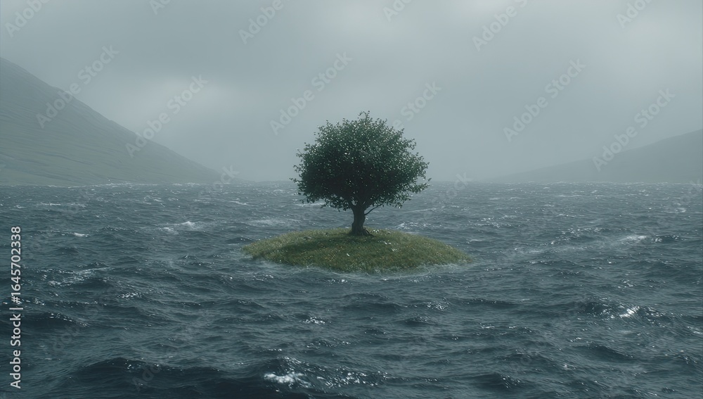 • A lone tree stands on a small island amidst stormy seas