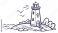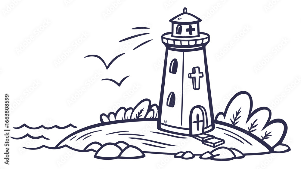 • Illustration of a lighthouse on an island with birds and waves in black and white outline style