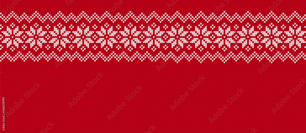 • Christmas knit background with snowflakes. Xmas geometric border. Holiday seamless pattern. Festive winter ornament. Knitted sweater print. Fair isle traditional texture. Vector.