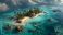 • Aerial view of tropical island surrounded by turquoise ocean water with wide open sky space for overlay text, perfect for travel, summer, and nature background concepts