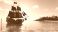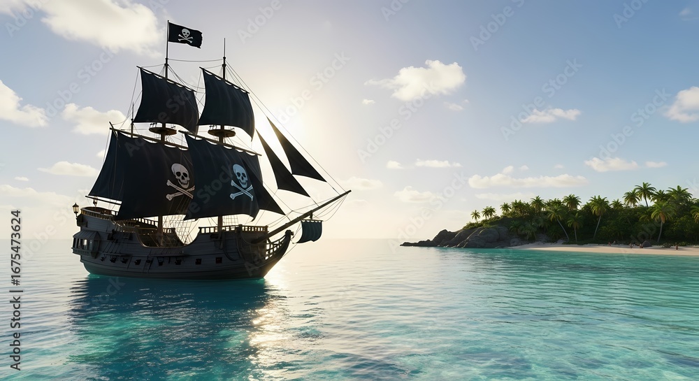 • A pirate ship with black sails, adorned with skull and crossbones, sails on turquoise ocean waters towards a tropical island under a bright, sunny sky.