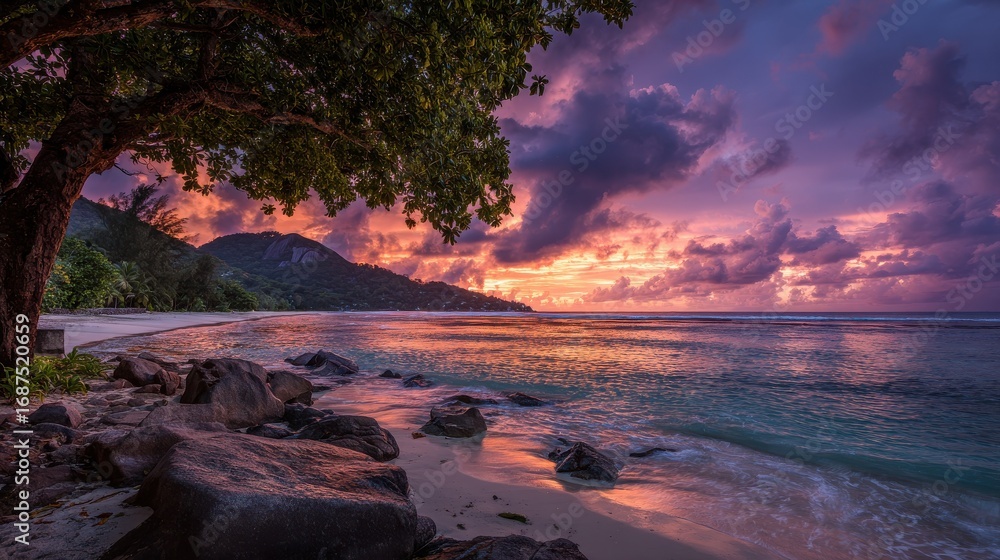 Plakat Wyspy - sunset on the beach takamaka mahe island seychelles no logos no brands ar 169 #1687520659